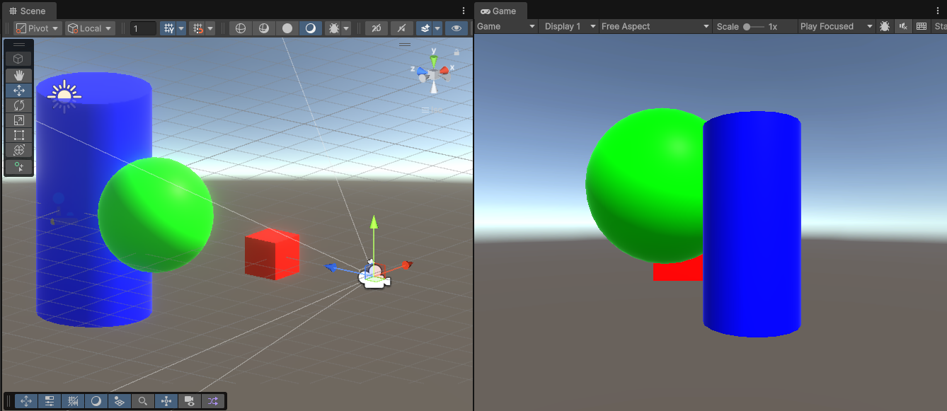 위에 이미지에서는 Scene 뷰에서 Cube → Sphere → Cylinder 순서로 오브젝트가 배치되어 있습니다. 하지만 Camera Stacking의 렌더링 순서를 조정함으로써 실제 게임 화면에서는 역순으로 렌더링된 모습을 확인할 수 있습니다.