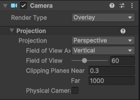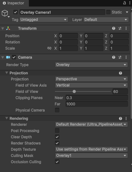 2. Overlay Camera로 사용할 새로운 Camera를 생성합니다 Render Type이 Overlay로 설정되어있는지 확인합니다